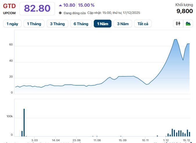 Chốt phiên giao dịch ngày 17/12, mã này tiếp tục tăng kịch trần phiên thứ hai liên tiếp, lên 82.800 đồng/cổ phiếu. So với mức giá chỉ 11.800 đồng/cp ghi nhận trong phiên 18/11, GTD đã tăng hơn 600% chỉ trong vòng một tháng, qua đó xác lập đỉnh giá cao nhất trong lịch sử giao dịch.