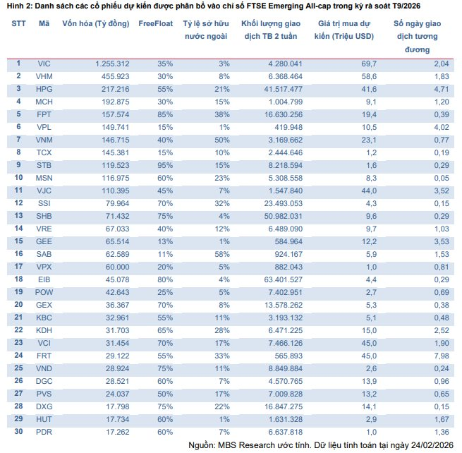 Với dữ liệu ngày 24/2/2026, MBS mô phỏng danh mục cổ phiếu có khả năng được lựa chọn vào bộ chỉ số FTSE Global All-Cap và khối lượng giao dịch trong kỳ review vào T9/2026.