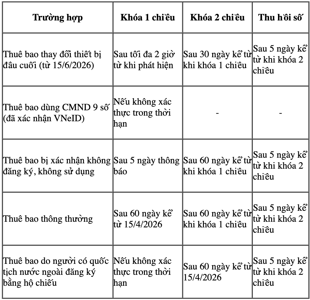 Các mốc thời gian khóa SIM 1 chiều, 2 chiều, thu hồi số khi không xác thực thông tin thuê bao theo đúng quy định