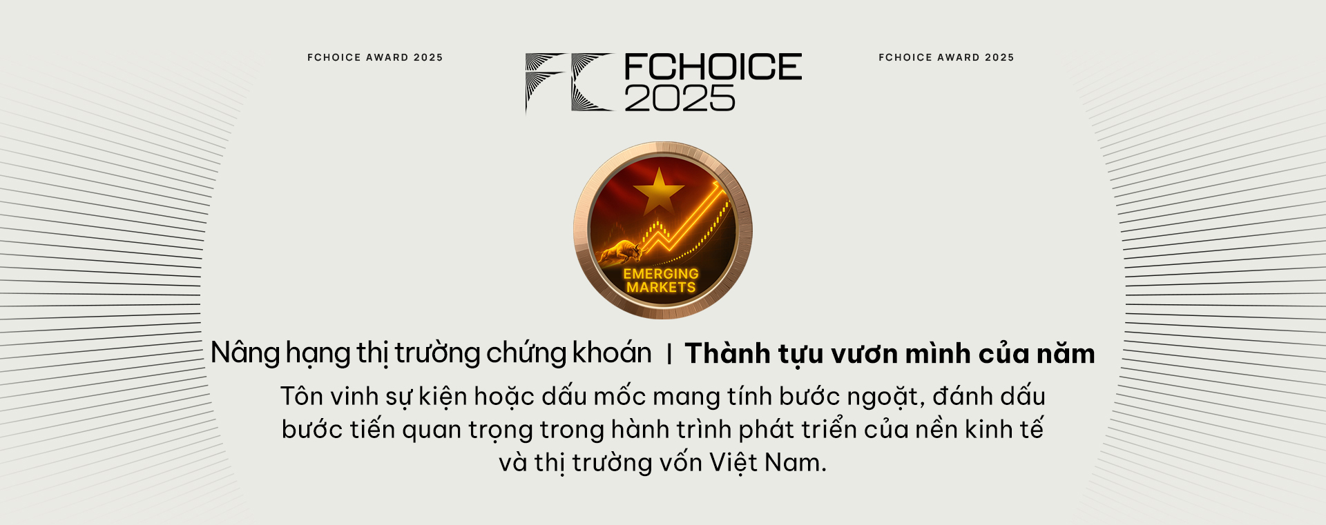 FChoice là bảng bình chọn thường niên do CafeF tổ chức, ra đời từ năm 2021. Đây không chỉ là một cuộc bình chọn thông thường mà là "bản đồ thành tựu" phản ánh những câu chuyện đột phá, có tác động quan trọng đến nền kinh tế quốc gia, đặc biệt trong lĩnh vực tài chính. Năm 2025, FChoice đã chính thức quay trở lại với thông điệp "Việt Nam vươn mình" với 4 nhóm hạng mục lớn.