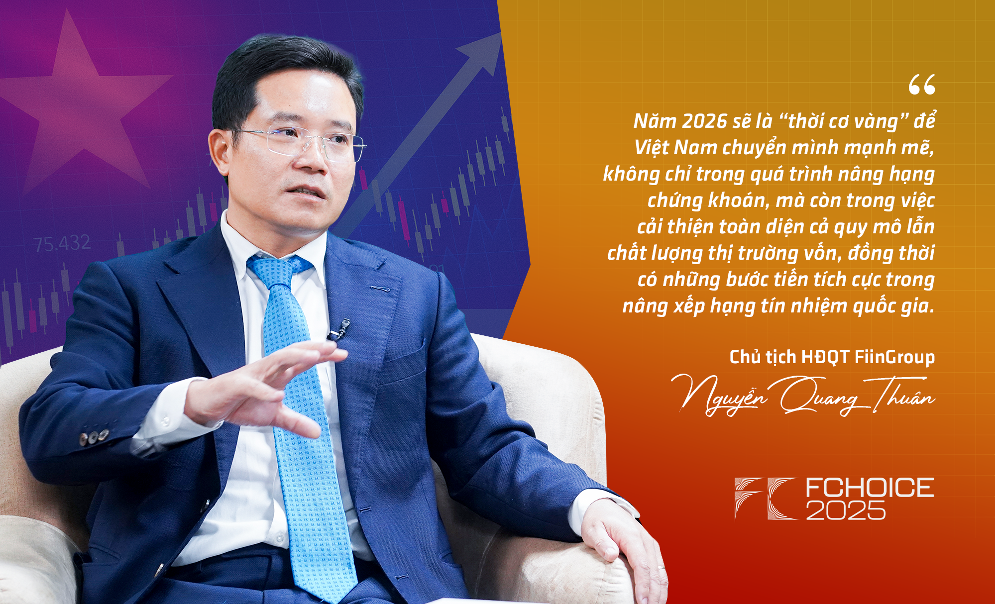 Ông Nguyễn Quang Thuân tin tưởng năm 2026 sẽ là "thời cơ vàng" để Việt Nam chuyển mình mạnh mẽ, không chỉ trong quá trình nâng hạng TTCK theo FTSE Russell và MSCI, mà còn trong việc cải thiện toàn diện cả quy mô lẫn chất lượng thị trường vốn, đồng thời có những bước tiến tích cực trong nâng xếp hạng tín nhiệm quốc gia. Khi các yếu tố này vận hành đồng bộ, thị trường vốn Việt Nam sẽ trở thành chìa khóa quan trọng để doanh nghiệp và Chính phủ giải bài toán huy động vốn, đồng thời tạo nền tảng vững chắc để thị trường thực sự "cất cánh" trong kỷ nguyên mới của đất nước.