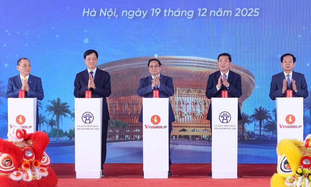 Thủ tướng và các đại biểu bấm nút khởi công, khánh thành các công trình tại điểm cầu Khu đô thị thể thao Olympic Hà Nội, hôm 19/12/2025. (Ảnh: Đắc Huy)