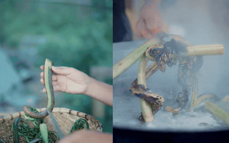 Thế nhưng, để biến thứ cây mọc hoang này thành món ngon dọn lên mâm cơm lại đòi hỏi cả một quá trình xắt thái, sơ chế đầy kinh nghiệm và sự khéo léo của người nấu. Khác với những loại rau xanh hái ngoài vườn rửa rẹt qua nước là xong, rau dớn khổng lồ bắt buộc phải được tước bỏ đi lớp vỏ ngoài già cỗi, xù xì, chỉ giữ lại phần lõi non tơ, xanh mướt bên trong. Đặc biệt, người ta phải chần sơ phần lõi này qua một nồi nước sôi sùng sục để loại bỏ hết đi những độc tố tự nhiên có trong nhựa cây và làm giảm bớt độ nhớt, sau đó vớt ra ngâm ngay vào chậu nước lạnh để rau giữ được độ giòn sần sật và màu xanh bắt mắt.