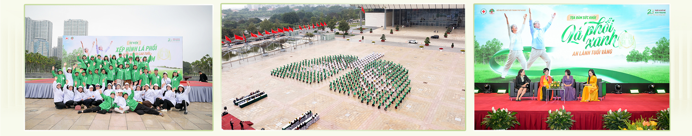 Chương trình "Lá phổi xanh - An lành tuổi vàng" hướng tới việc kết nối, chia sẻ và lan tỏa những giá trị thiết thực trong chăm sóc sức khỏe hô hấp cho người trung niên và cao tuổi. Hưởng ứng mục tiêu giúp 20 triệu người trung niên, cao tuổi có hệ hô hấp khỏe mạnh, Thuốc ho bổ phế Bảo Thanh triển khai nhiều hoạt động ý nghĩa. Nổi bật là màn xếp hình "lá phổi xanh" của 500 hội viên người cao tuổi, qua đó xác lập kỷ lục Việt Nam và lan tỏa thông điệp về chăm sóc sức khỏe hô hấp.