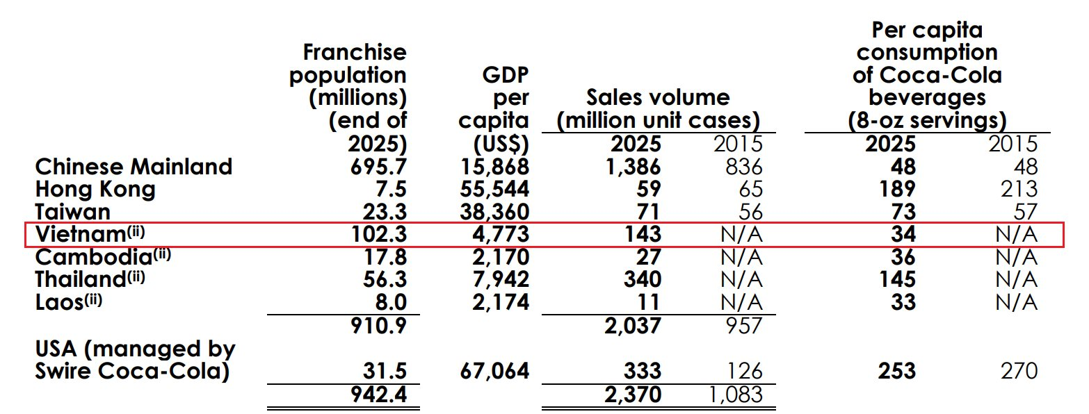 Báo cáo thường niên của Swire Pacific, hiện là đơn vị kinh doanh Coca-Cola tại Việt Nam, cho thấy lượng tiêu thụ trung bình trên đầu người tại nước ta trong cả năm 2025 là 34 khẩu phần (mỗi khẩu phần là 8 ounces). Con số này tương đương 8 lít mỗi năm.
