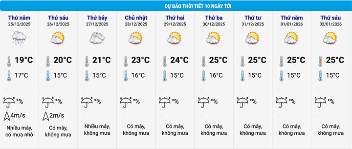 Ngày 28-29/12, khu vực này có mây, không mưa, nhiệt độ cao nhất tiếp tục tăng lên ngưỡng 23-24°C, thấp nhất dao động mức 15-16°C.