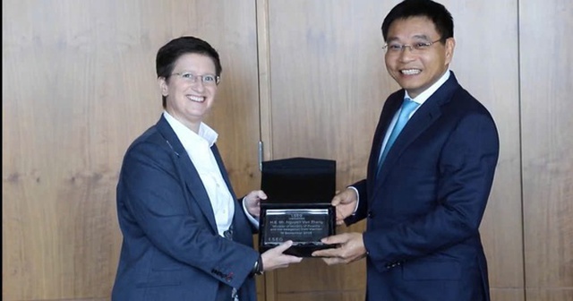 Bộ Trưởng Nguyễn Văn Thắng nhận quà là biểu tượng LSE từ bà Julis Hoggett