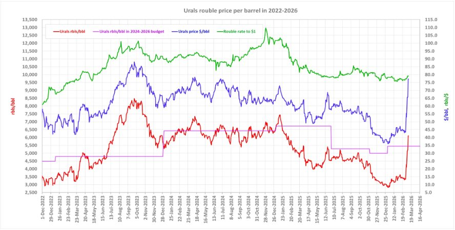Theo tính toán của Reuters dựa trên dữ liệu từ các nguồn trong ngành, giá dầu thô của Nga dùng để tính thuế đã đạt khoảng 6.105 rúp/thùng vào đầu tuần, tăng khoảng 82% so với ngày 27/2, thời điểm trước khi căng thẳng tại Iran diễn ra.