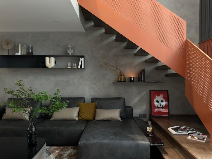 Chiếc sofa màu đen xám được đặt cạnh cầu thang màu cam nổi bật