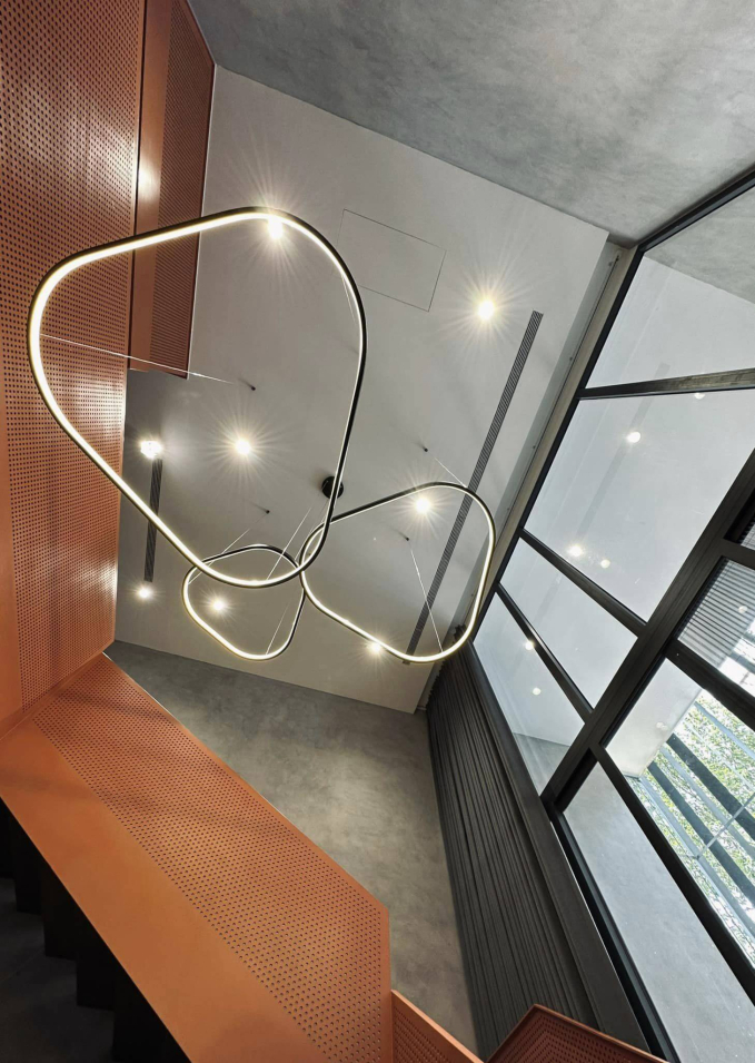 Không gian sống của gia đình JustaTee mang đậm dấu ấn hiện đại, sang trọng với bảng màu chủ đạo là đen và cam đất, vừa cá tính vừa ấm áp. Tổng thể căn nhà gây ấn tượng ngay từ cái nhìn đầu tiên bởi sự chỉn chu trong cách phối màu và bố cục. Bên trong, không gian mở được xử lý tinh tế với tông đen - xám làm nền, giúp tôn lên vẻ đẹp tối giản nhưng không hề đơn điệu. Phòng khách nằm ở khu vực phía trước, được thiết kế rộng rãi, thoáng đãng. Điểm nhấn nổi bật là cầu thang bộ màu cam đất nổi bật giữa tổng thể trầm, giúp không gian trở nên sinh động hơn.