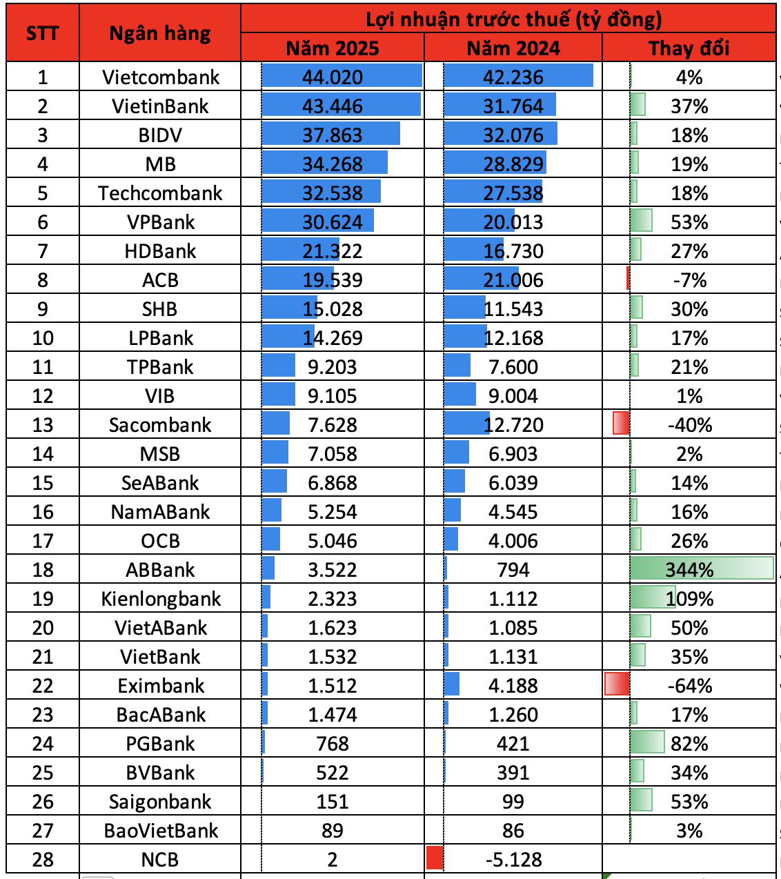 Toàn cảnh bức tranh lợi nhuận ngân hàng 2025: Vietcombank, VietinBank và BIDV vẫn bỏ xa nhóm tư nhân, nhiều nhà băng nhỏ tăng trưởng đột biến