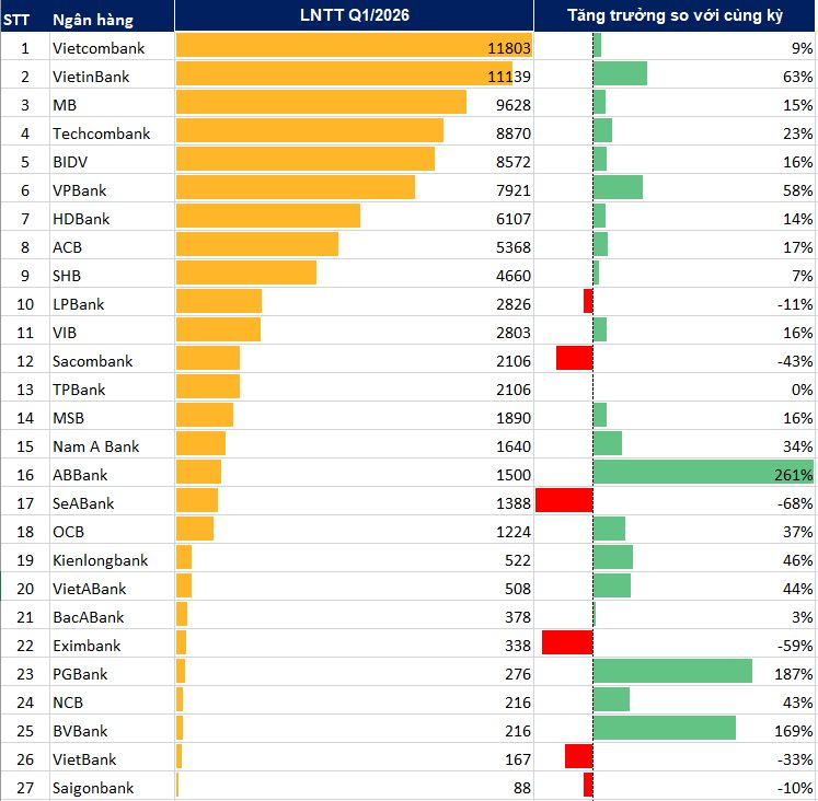 Toàn cảnh lợi nhuận ngân hàng quý 1/2026: Quán quân chính thức lộ diện