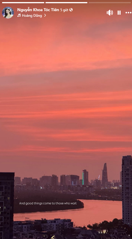 Trên trang cá nhân, nữ ca sĩ sinh năm 1989 mới đây khiến cư dân mạng chú ý khi đăng tải story đầy tâm trạng suy tư. Tóc Tiên chia sẻ hình ảnh chụp hoàng hôn từ căn chung cư ở thành phố Hồ Chí Minh.