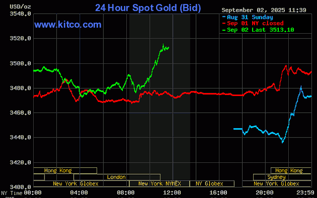 Tối 2/9, giá vàng tiếp tục tăng mạnh và lập kỷ lục mới. Cập nhật đến 22h30, giá vàng giao ngay đã lên 3.515 USD/ounce.