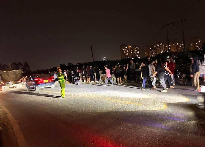 Cán bộ công an điều tiết giao thông khu vực khi có nhiều người dân đổ về theo dõi công tác tìm kiếm.