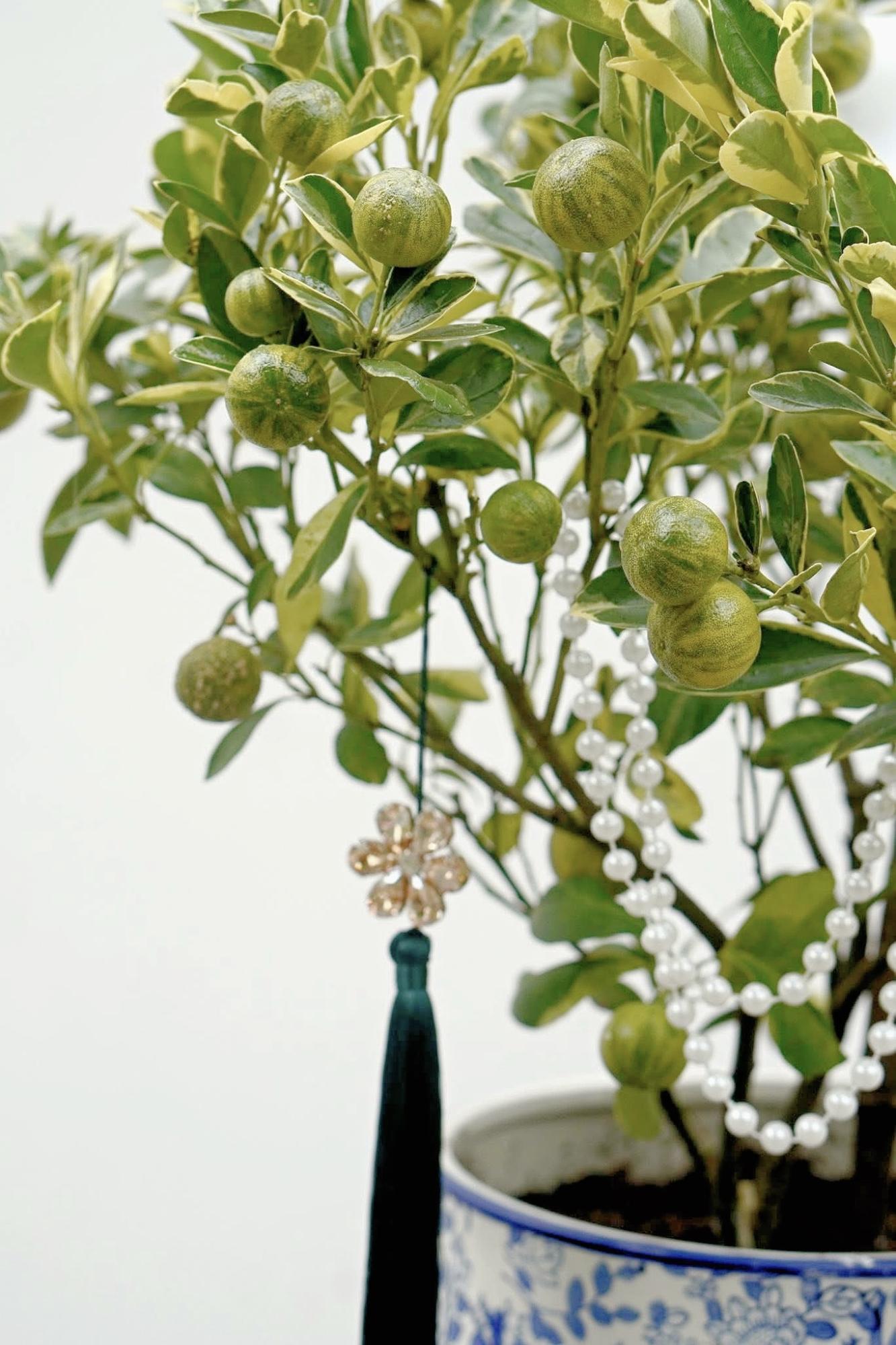 Để quất cẩm thạch phối hợp hoàn hảo với nhà sang, hãy trồng trong chậu sứ men xanh, trang trí thêm vòng ngọc trai – sẽ giúp tăng độ nữ tính, sự tinh tế và sang trọng lên rất nhiều lần.
