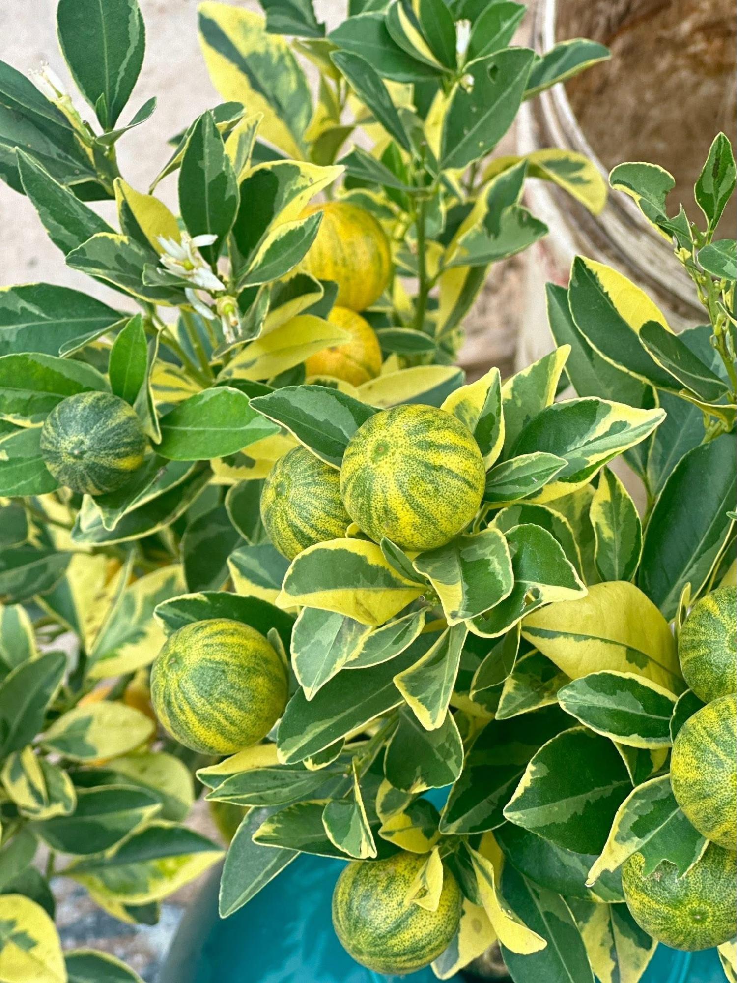 Quất cẩm thạch (hay còn gọi là tắc cẩm thạch, quất kim cương – Citrus microcarpa variegata) là giống biến thể đặc biệt của cây quất thông thường. Điểm nhấn chính nằm ở lá hình bầu dục xen lẫn vân trắng kem hoặc vàng nhạt, tạo hiệu ứng cẩm thạch lạ mắt. Quả thì "biến hóa" theo giai đoạn: non thì xanh sọc trắng, chín chuyển sang vàng óng xen sọc xanh-trắng – đẹp từ lúc mới nở đến khi chín mọng, giúp trưng bày suốt Tết mà không bao giờ nhàm chán.