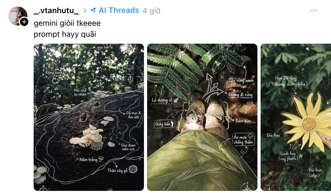 Bên cạnh đó, trào lưu này được hưởng ứng mạnh là vì cảm giác “cá nhân hoá”. Không giống filter có sẵn, mỗi bức ảnh tạo ra đều khác nhau tuỳ vào cách mỗi người nhập câu lệnh. Có người chọn phong cách ghi chú khoa học, có người lại biến ảnh thành kiểu nhật ký du lịch, thậm chí có bạn còn viết thêm những dòng caption nhỏ ngay trên ảnh kiểu ghi chú của ngày hôm đó.