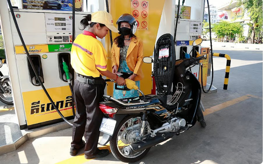 Một phụ nữ đổ xăng một trạm xăng ở Phnom Penh (Campuchia). Ảnh: EPA