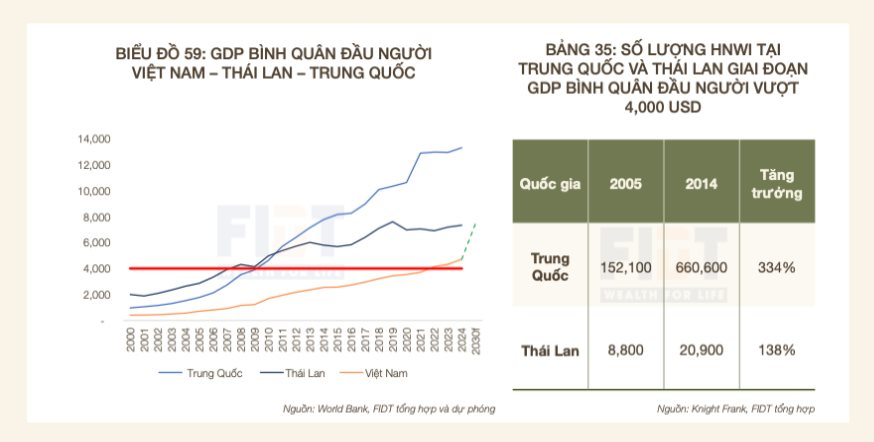 Dữ liệu từ Khối Nghiên cứu FIDT chỉ ra sự tương đồng giữa quỹ đạo tăng trưởng GDP bình quân đầu người của Việt Nam hiện nay với giai đoạn phát triển nhanh của Trung Quốc và Thái Lan trong quá khứ. Đây là cơ sở để đơn vị này dự báo về sự gia tăng của tầng lớp siêu giàu (HNWI) và tài sản tích lũy trong dân cư.