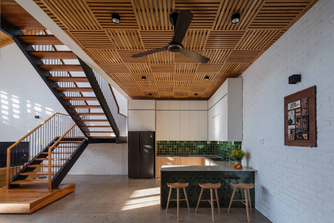 Các khoang trên cùng cao sát trần thường dùng để lưu trữ đồ ít sử dụng như nồi lớn, hộp đựng đồ, đồ dùng theo mùa. Phần ngang tầm tay được dành cho bát đĩa, gia vị và vật dụng nấu nướng hằng ngày. Nhờ cách tổ chức này, dù tủ cao kịch trần không gian vẫn không tạo cảm giác "đè nặng" lên thị giác.