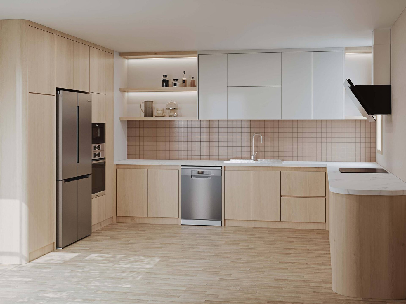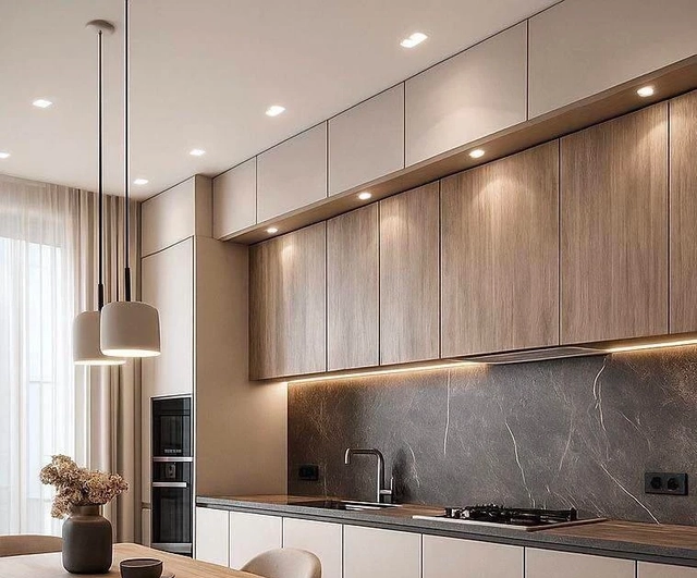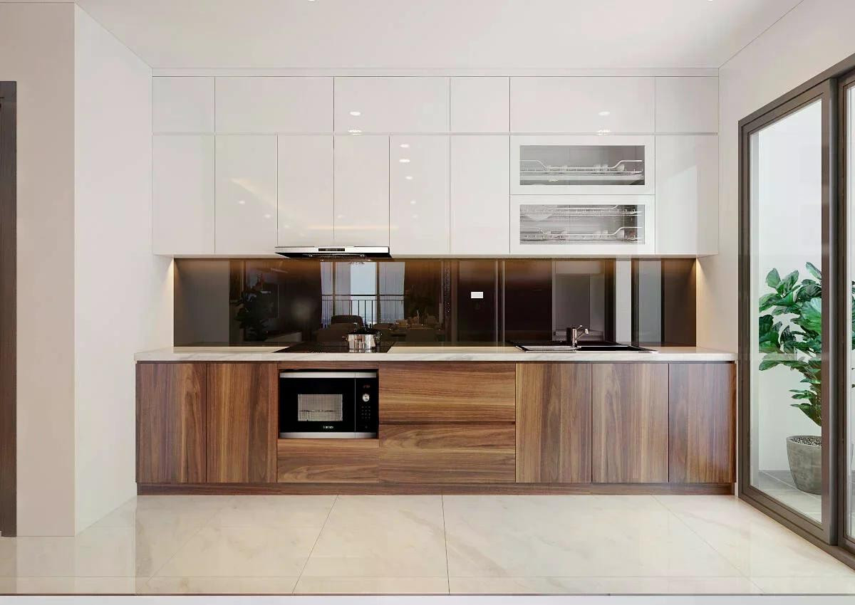 Ở các căn hộ chung cư, nơi diện tích bếp thường hạn chế, tủ bếp kịch trần cánh phẳng đang chiếm ưu thế. Thiết kế ít chi tiết, bề mặt phẳng, tay nắm âm hoặc hệ mở chạm giúp tổng thể trông liền mạch và cao ráo hơn.