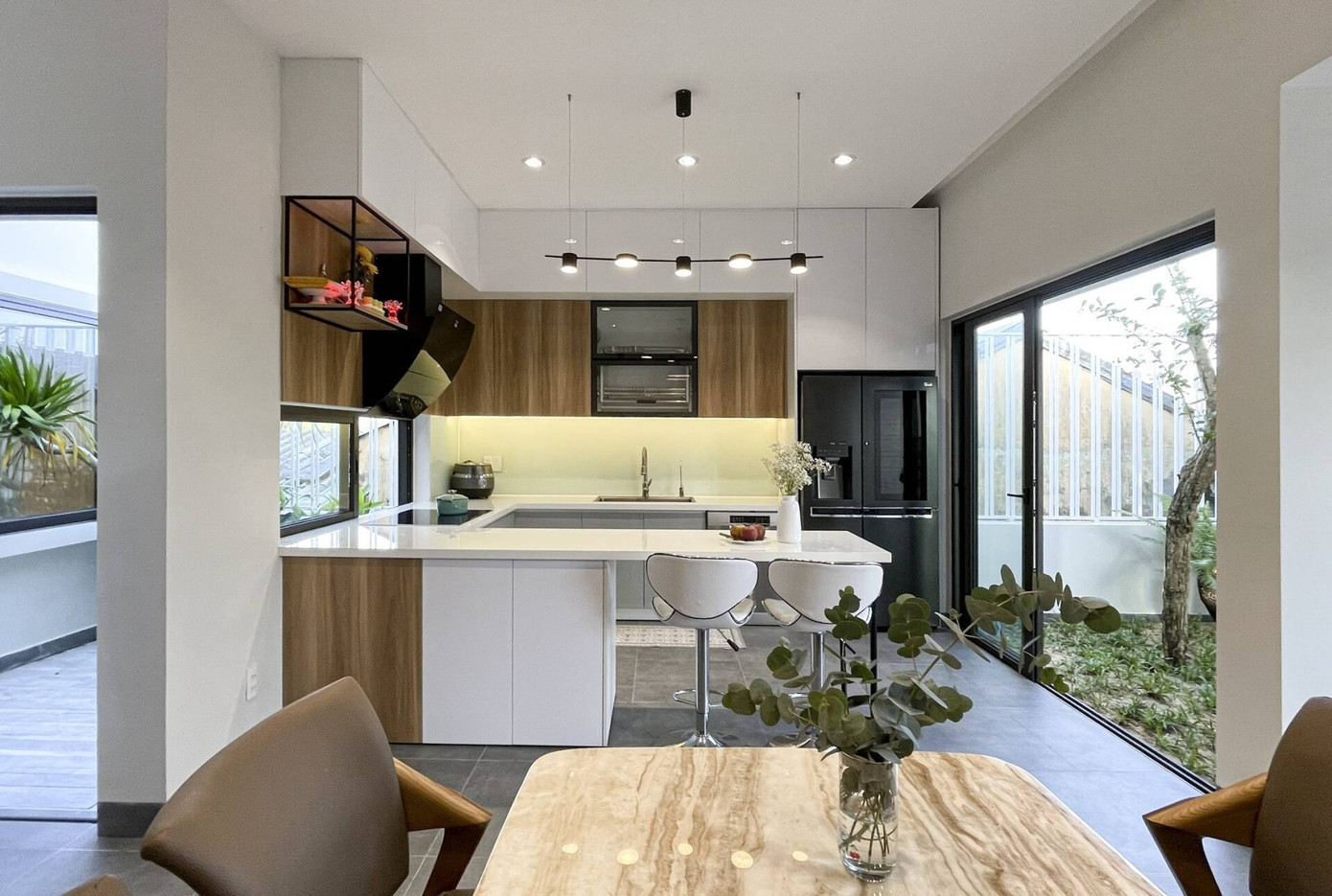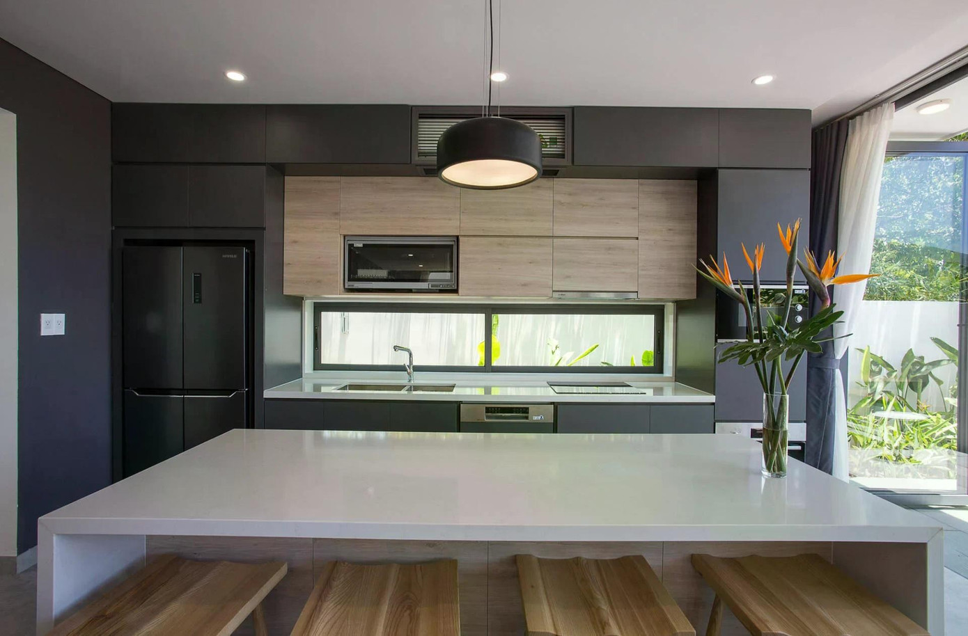 Trong nhiều căn hộ hiện đại, phần nóc tủ bếp từng là "vùng đất bị lãng quên", nơi bụi bẩn và dầu mỡ tích tụ theo thời gian, khó lau chùi, lại làm tổng thể trông thiếu hoàn thiện. Chính vì vậy, tủ bếp kịch trần với thiết kế đẩy hệ tủ trên chạm sát trần nhà dần trở thành giải pháp được ưa chuộng.