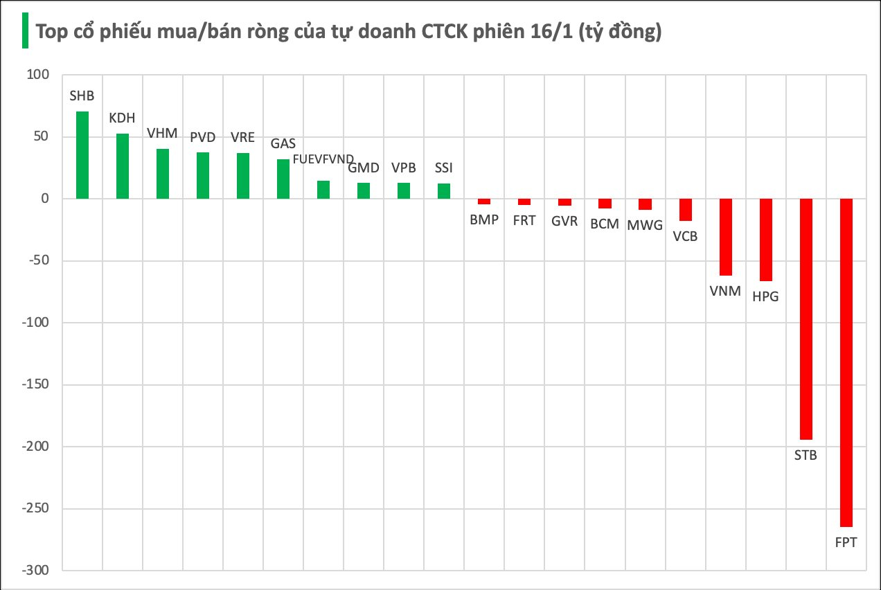 Cụ thể, nhóm tự doanh CTCK bán ròng mạnh nhất tại FPT với giá trị -265 tỷ đồng, tiếp theo là STB (-194 tỷ), HPG (-66 tỷ), VNM (-62 tỷ) và VCB (-18 tỷ đồng). Một số cổ phiếu khác cũng ghi nhận lực bán ròng đáng kể như MWG (-9 tỷ), BCM (-8 tỷ), GVR (-5 tỷ), FRT (-5 tỷ) và BMP (-4 tỷ đồng).