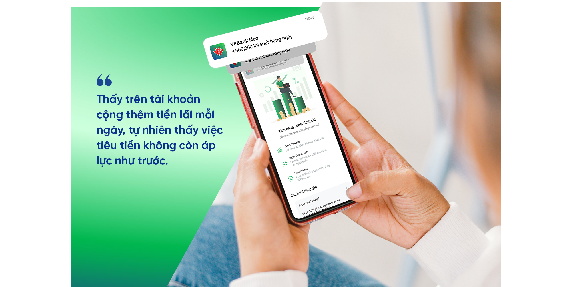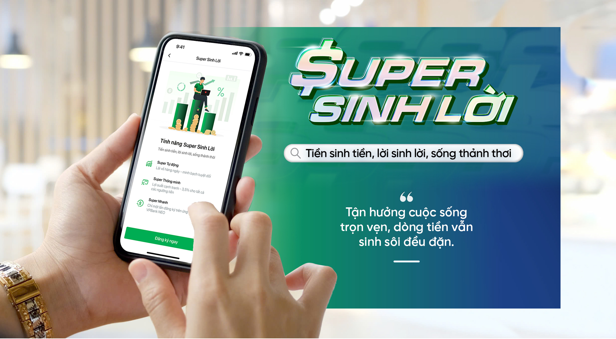 Super Sinh lời – sản phẩm dành cho những ai không muốn tiền ngủ yên – mang đến một trải nghiệm tài chính hoàn toàn mới. Công cụ này được xây dựng dựa trên 3 giá trị cốt lõi: "Super Thông minh" – lợi suất cạnh tranh 3,5%/năm cho mọi mức số dư; "Super Tự động" – lãi được trả hàng ngày, minh bạch tuyệt đối; và "Super nhanh" – chỉ cần đăng ký một lần trên ứng dụng VPBank NEO.