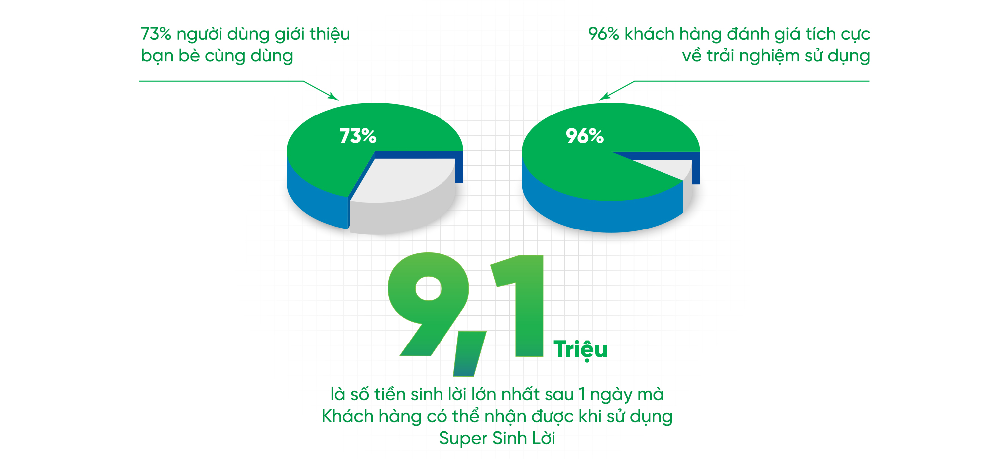 Điểm độc đáo của bộ công cụ này nằm ở sự thích ứng vượt trội với mọi phân khúc. Một bạn trẻ với mức thu nhập trung bình có thể bắt đầu chỉ với 5 triệu đồng. Một nhân viên văn phòng có dòng tiền ổn định có thể tận dụng khoản tiền nhàn rỗi mỗi ngày từ Super Sinh lời như một khoản thu nhập thụ động bổ sung. Một chủ hộ kinh doanh có thể tận dụng chứng chỉ Super Thịnh Vượng như một nơi giữ tiền ngắn hạn trong khi chờ hàng về hay thanh toán nhà cung cấp.
