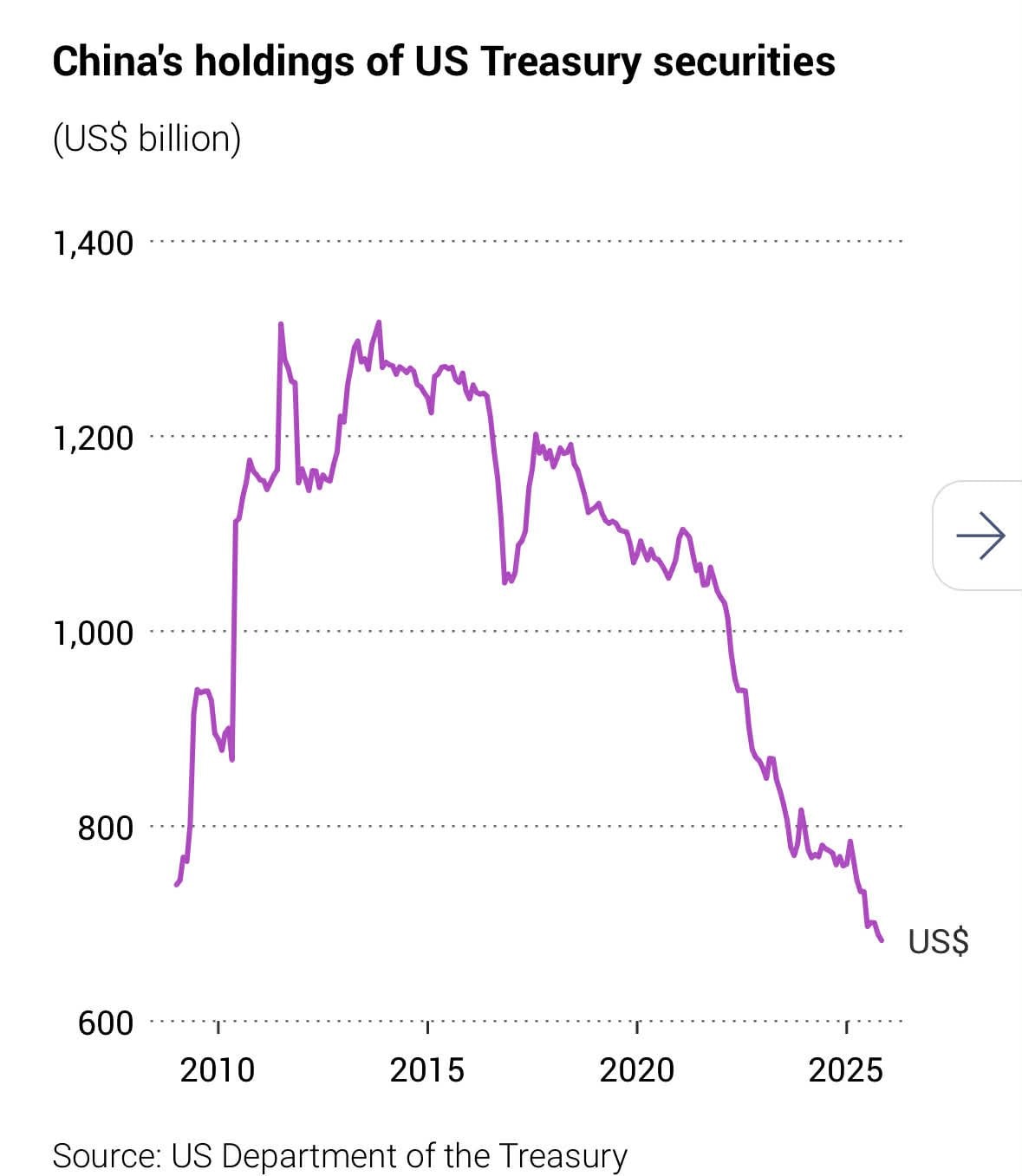 Trong khi đó, Trung Quốc đã âm thầm cắt giảm một nửa lượng trái phiếu chính phủ Mỹ kể từ năm 2013. Từ mức 1,2 nghìn tỷ USD, Bắc Kinh chỉ còn nắm giữ 682,6 tỷ USD trái phiếu chính phủ Mỹ vào tháng 11/2025. Ngoài ra, con số này thấp hơn so với mức 688,7 tỷ USD của tháng trước đó và giảm gần 10% so với đầu năm ngoái.