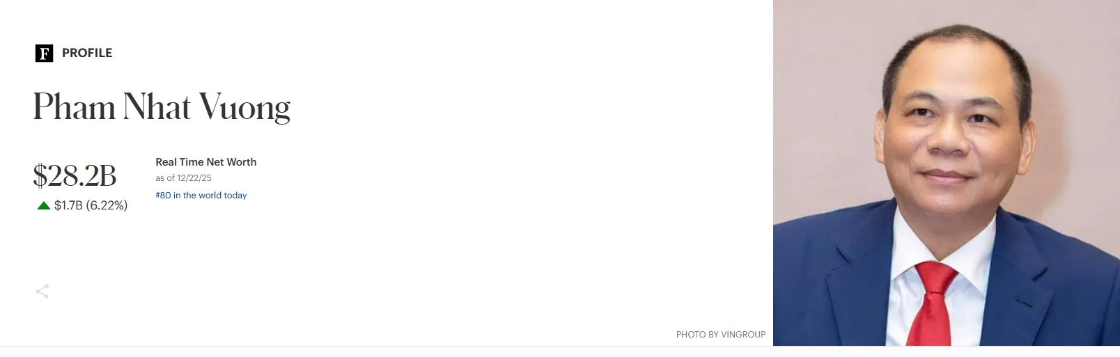 Mức tài sản này đưa ông Vượng lên vị trí thứ 80 trong danh sách những người giàu nhất thế giới.