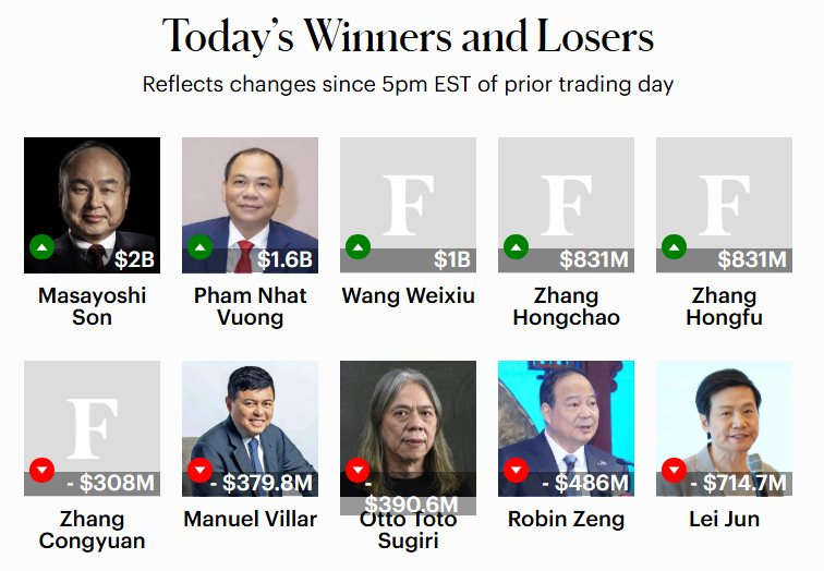 Diễn biến giá cổ phiếu đã tác động đến thống kê tài sản của người đứng đầu Vingroup. Theo dữ liệu thời gian thực từ Forbes, chốt phiên 22/12, tài sản ròng của tỷ phú Phạm Nhật Vượng đạt 28,1 tỷ USD - tăng 1,7 tỷ USD so với phiên trước. Tỷ phú Phạm Nhật Vượng đứng thứ 2 sau Masayoshi Son về tốc độ tăng trưởng tài sản trong ngày.