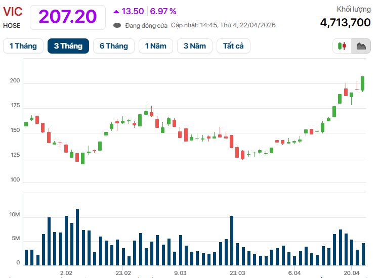 Kết thúc phiên giao dịch ngày 22/4, cổ phiếu VIC của Vingroup đã tăng hết biên độ lên mức giá trần 207.200 đồng/cp, trắng bên bán với hơn 4,7 triệu cổ phiếu được giao dịch.