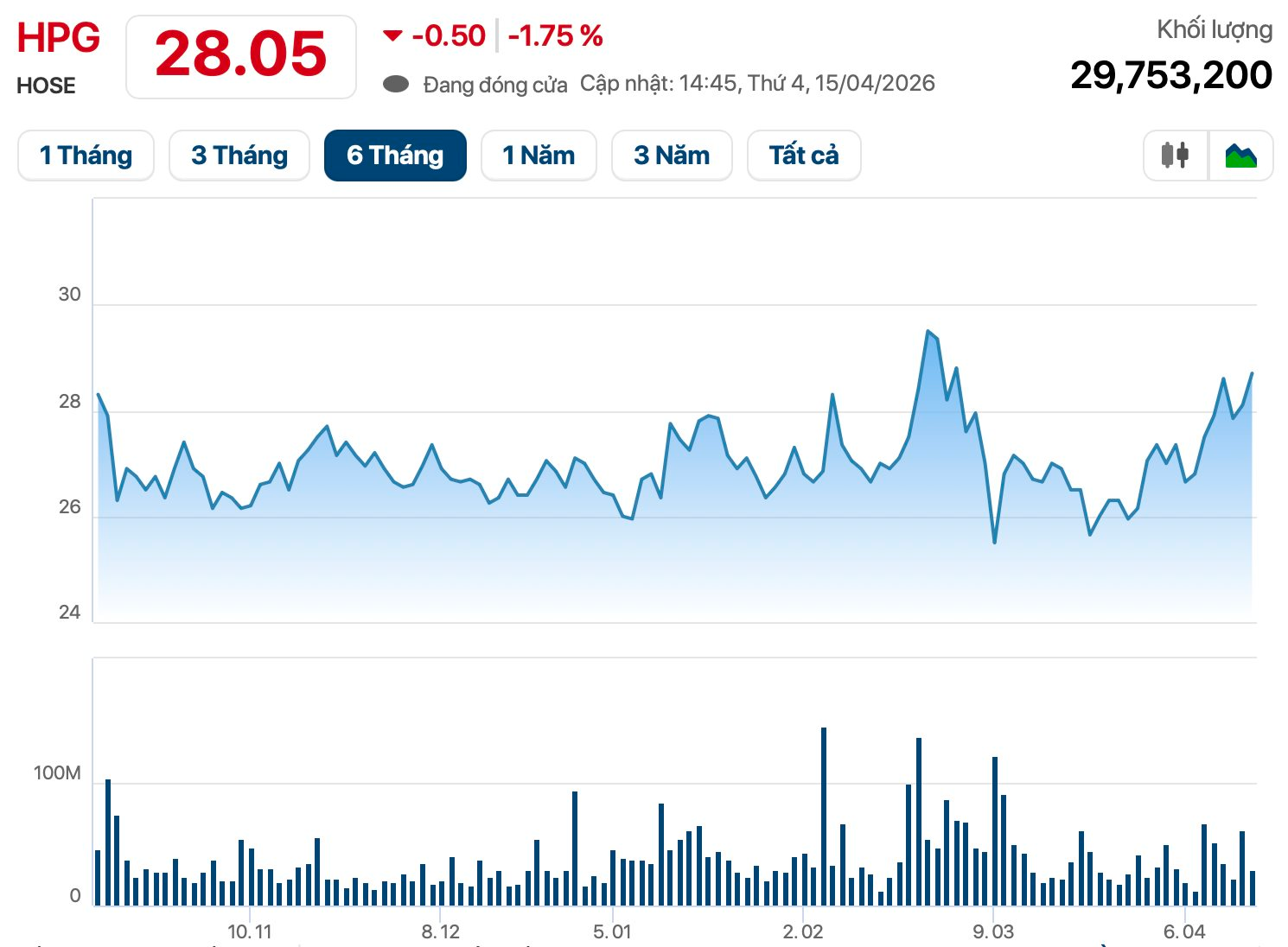 Trên sàn chứng khoán, cổ phiếu HPG của Hòa Phát là một trong các bluechip thuộc rổ VN30, thu hút sự quan tâm rất lớn của nhà đầu tư. Với 300.000 cổ đông, nhiều nhất thị trường, HPG được các nhà đầu tư trong và ngoài nước ưu ái gọi là “cổ phiếu quốc dân”. Hiện tại, thị giá HPG đang dừng ở mức 28.050 đồng/cp, vốn hóa thị trường tương ứng hơn 215.000 tỷ đồng.