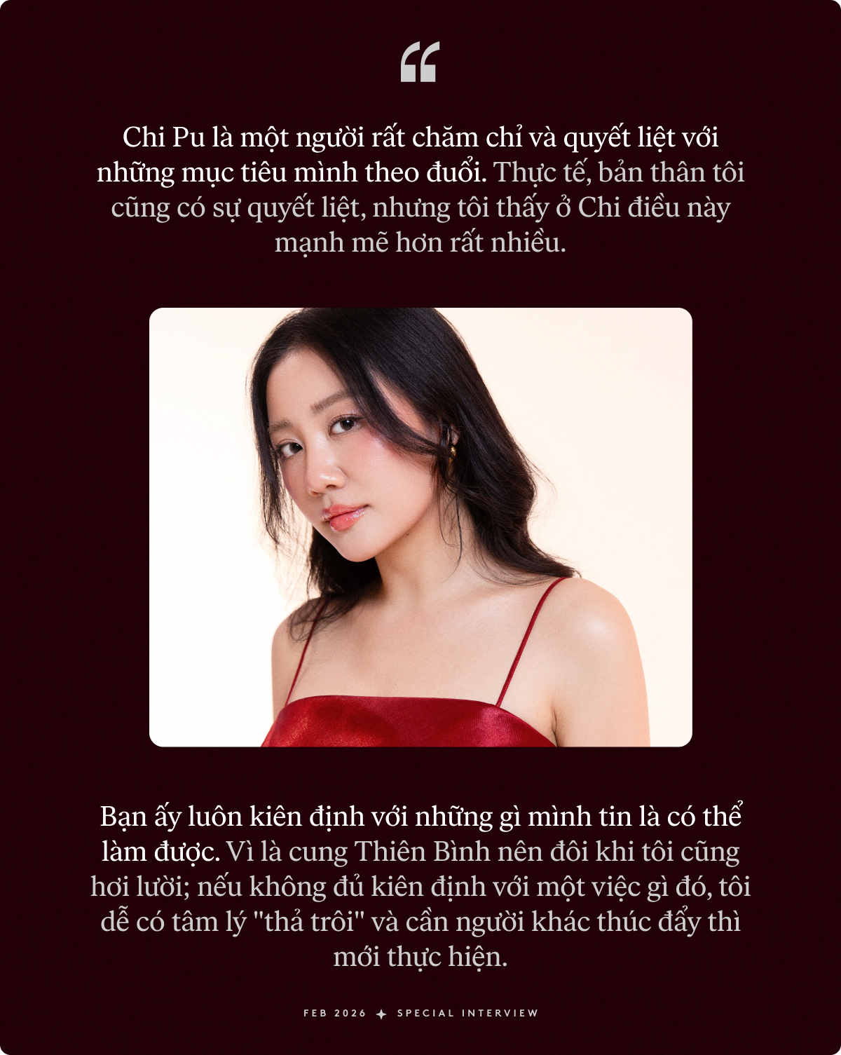 Chi Pu là một người rất chăm chỉ và quyết liệt với những mục tiêu mình theo đuổi. Thực tế, bản thân tôi cũng có sự quyết liệt, nhưng tôi thấy ở Chi điều này mạnh mẽ hơn rất nhiều. Bạn ấy luôn kiên định với những gì mình tin là có thể làm được.