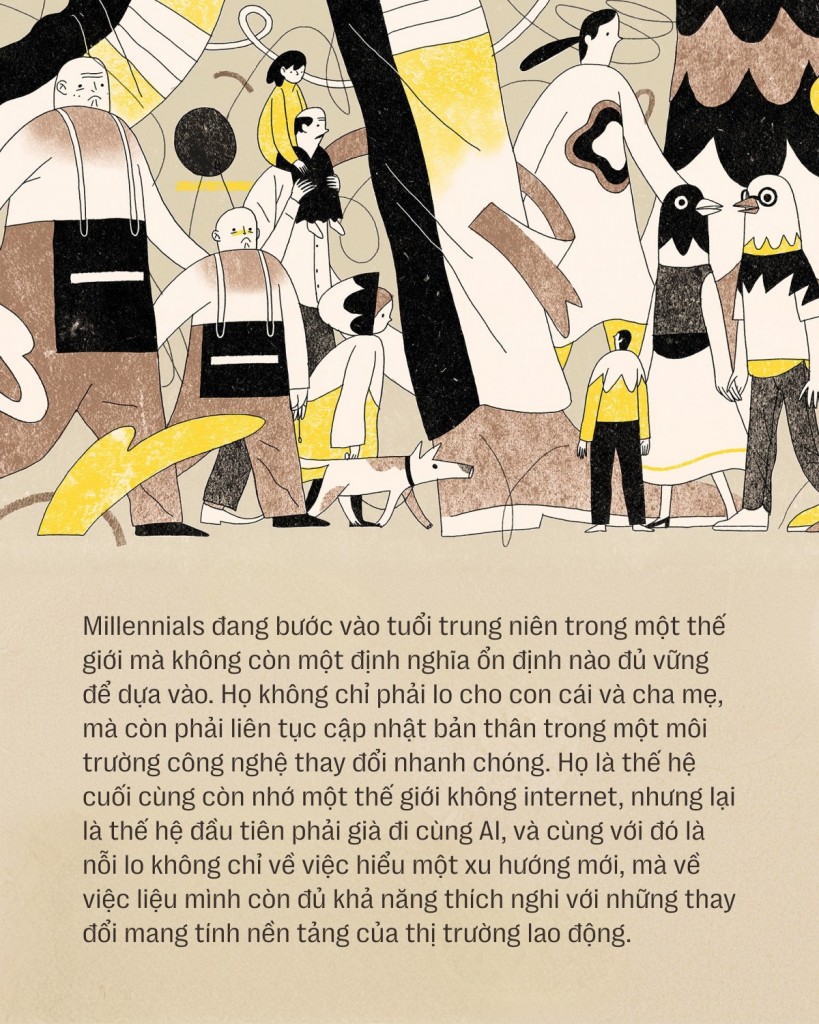 Ba lát cắt khác nhau, nhưng cùng hội tụ ở một điểm: Millennials đang bước vào tuổi trung niên trong một thế giới mà không còn một định nghĩa ổn định nào đủ vững để dựa vào. Họ không chỉ phải lo cho con cái và cha mẹ, mà còn phải liên tục cập nhật bản thân trong một môi trường công nghệ thay đổi nhanh chóng. Họ là thế hệ cuối cùng còn nhớ một thế giới không internet, nhưng lại là thế hệ đầu tiên phải già đi cùng AI, và cùng với đó là nỗi lo không chỉ về việc hiểu một xu hướng mới, mà về việc liệu mình còn đủ khả năng thích nghi với những thay đổi mang tính nền tảng của thị trường lao động.
