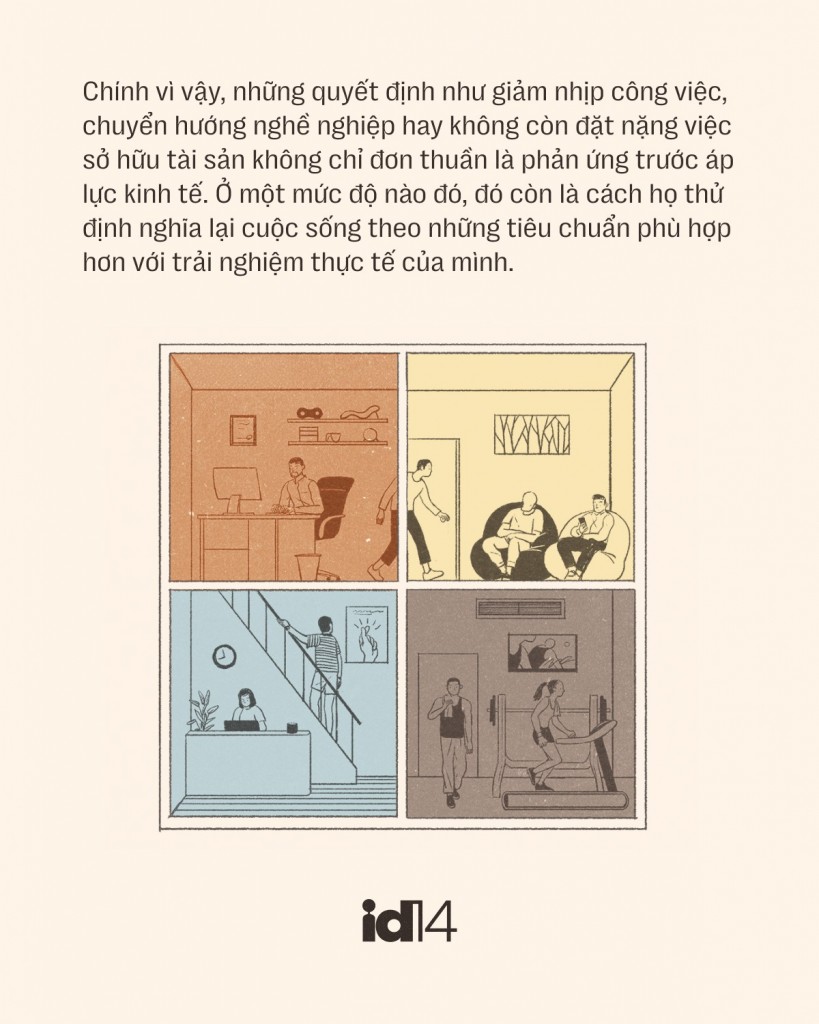 Chính vì vậy, những quyết định như giảm nhịp công việc, chuyển hướng nghề nghiệp hay không còn đặt nặng việc sở hữu tài sản không chỉ đơn thuần là phản ứng trước áp lực kinh tế. Ở một mức độ nào đó, đó còn là cách họ thử định nghĩa lại cuộc sống theo những tiêu chuẩn phù hợp hơn với trải nghiệm thực tế của mình.