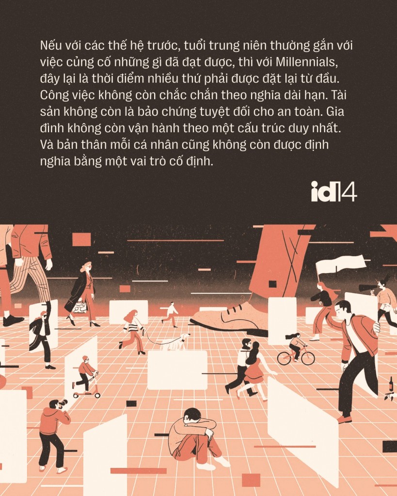 Điều đáng chú ý là trạng thái này xuất hiện đúng vào giai đoạn từng được xem là ổn định nhất của đời người. Nếu với các thế hệ trước, tuổi trung niên thường gắn với việc củng cố những gì đã đạt được, thì với Millennials, đây lại là thời điểm nhiều thứ phải được đặt lại từ đầu. Công việc không còn chắc chắn theo nghĩa dài hạn. Tài sản không còn là bảo chứng tuyệt đối cho an toàn. Gia đình không còn vận hành theo một cấu trúc duy nhất. Và bản thân mỗi cá nhân cũng không còn được định nghĩa bằng một vai trò cố định.