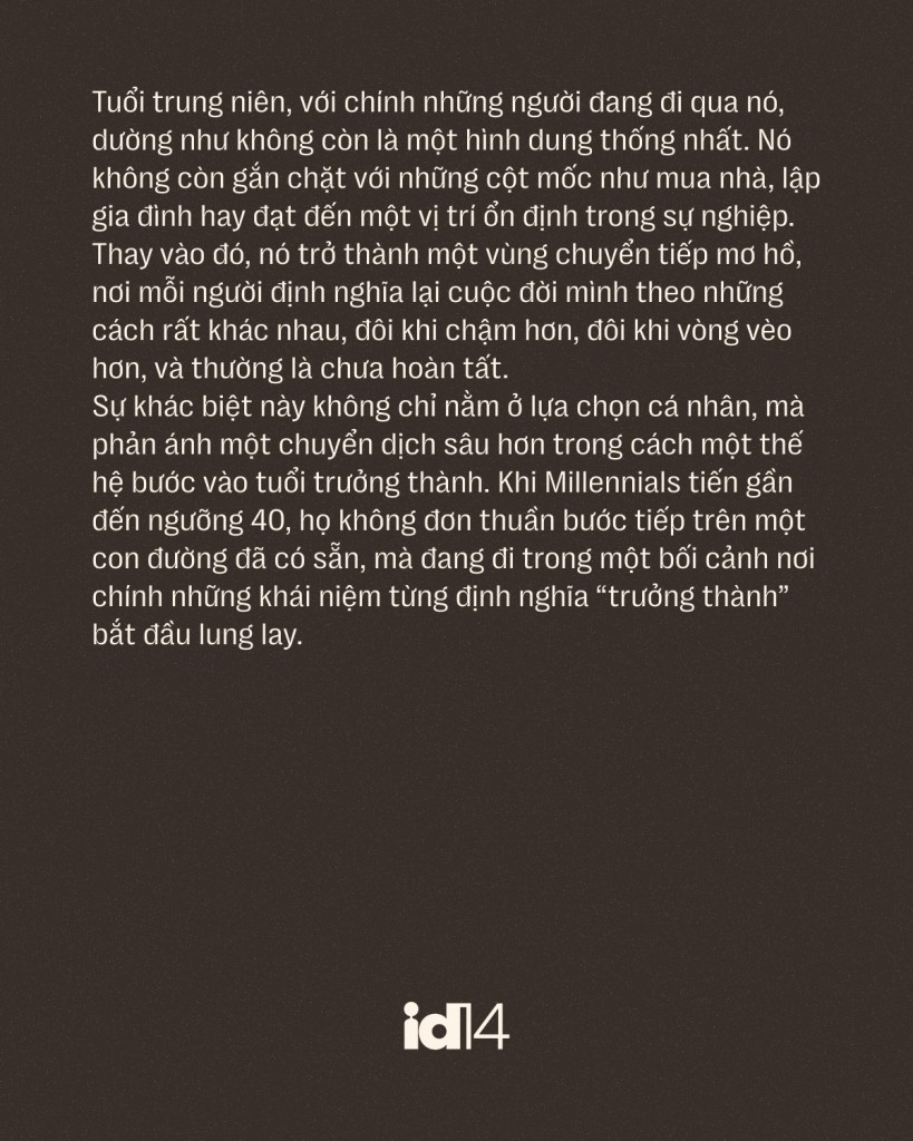 Tuổi trung niên của Millennials không còn là điểm đến của sự ổn định, mà trở thành một vùng chuyển tiếp liên tục, nơi mỗi lựa chọn, dù nhỏ, đều mang theo sức nặng của việc phải định nghĩa lại cuộc đời trong một thế giới không còn giữ nguyên luật chơi cũ.