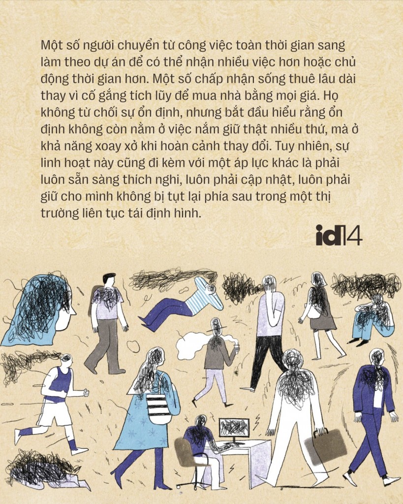 Những câu chuyện như của Trường không còn hiếm trong đời sống đô thị hiện nay. Một số người chuyển từ công việc toàn thời gian sang làm theo dự án để có thể nhận nhiều việc hơn hoặc chủ động thời gian hơn. Một số chấp nhận sống thuê lâu dài thay vì cố gắng tích lũy để mua nhà bằng mọi giá. Họ không từ chối sự ổn định, nhưng bắt đầu hiểu rằng ổn định không còn nằm ở việc nắm giữ thật nhiều thứ, mà ở khả năng xoay xở khi hoàn cảnh thay đổi. Tuy nhiên, sự linh hoạt này cũng đi kèm với một áp lực khác là phải luôn sẵn sàng thích nghi, luôn phải cập nhật, luôn phải giữ cho mình không bị tụt lại phía sau trong một thị trường liên tục tái định hình.