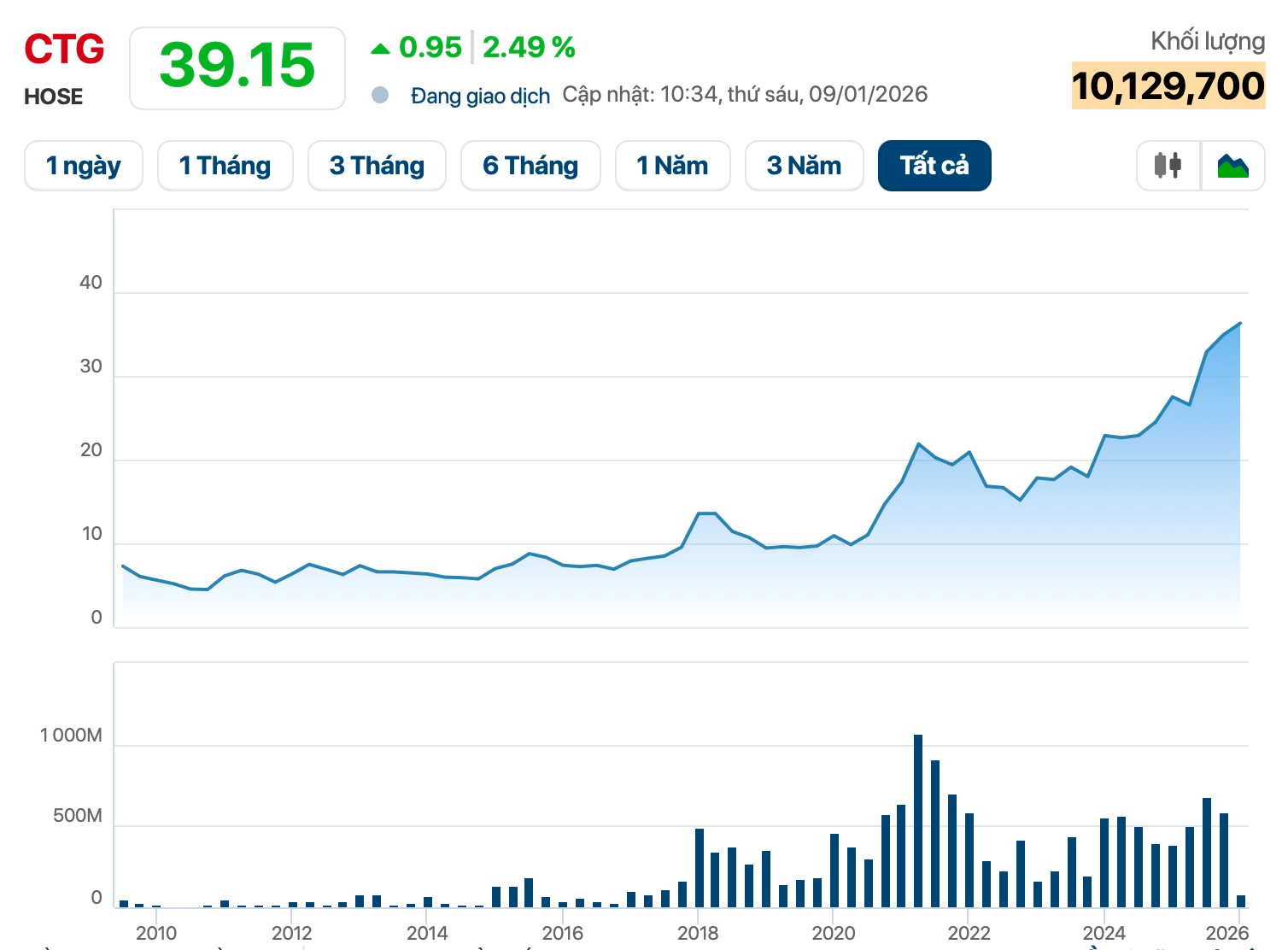 Nếu tiếp tục tăng giá hôm nay, CTG có chuỗi 4 phiên đi lên liên tiếp, từ quanh 35.500 đồng/cp, tương ứng tỷ lệ 10% và tích cực nhất trong nhóm cổ phiếu ngân hàng kể từ đầu năm 2026. Cùng với diễn biến giá khởi sắc, thanh khoản cổ phiếu CTG cải thiện rõ nét khi dòng tiền lớn gia nhập. Phiên giao dịch 8/1 ghi nhận mức thanh khoản cao nhất trong 3 năm trở lại đây.