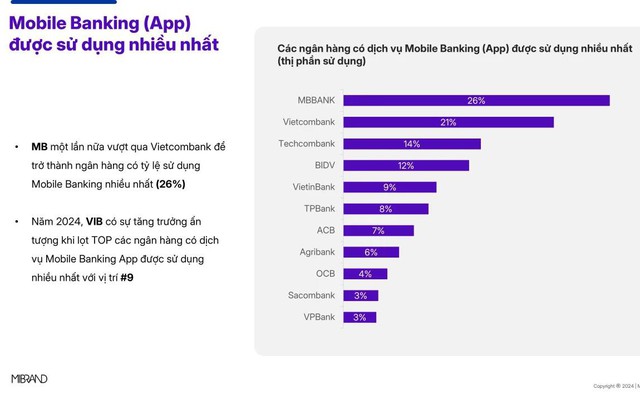 MBBank vươn lên đứng đầu về mức độ sử dụng ứng dụng ngân hàng - trong đó, Growth Loop đóng vai trò không nhỏ. (Theo"Báo cáo Sức khỏe Thương hiệu Ngân hàng Việt Nam 2024" của Mibrand)