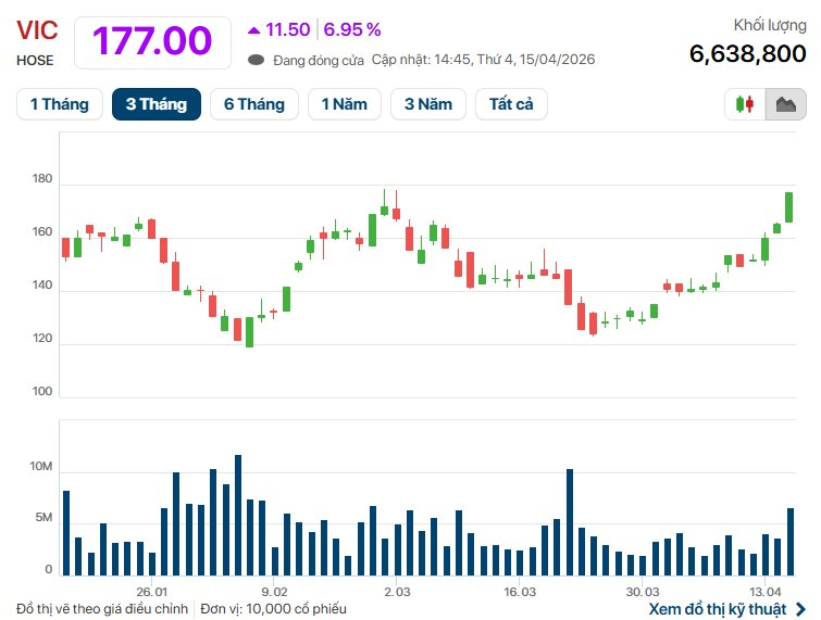 Kết thúc phiên giao dịch ngày 15/4, cổ phiếu VIC của Vingroup tăng kịch trần và đóng cửa ở 177.000 đồng/cp, mức giá đóng cửa cao nhất lịch sử. Vốn hóa của Vingroup đạt gần 1,4 triệu tỷ đồng.