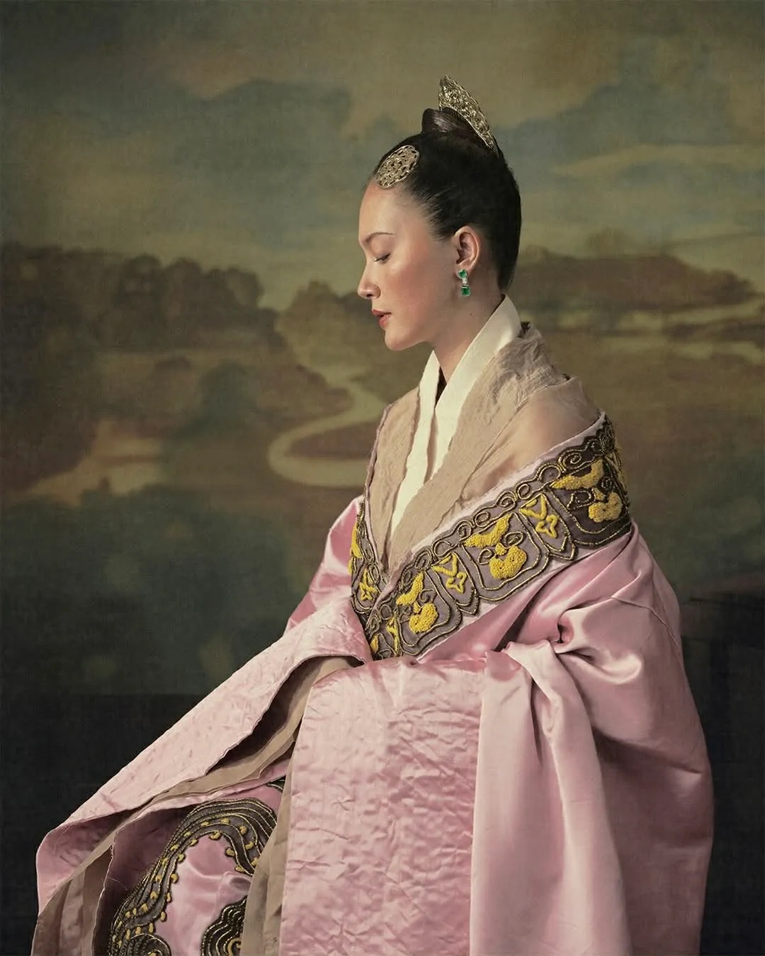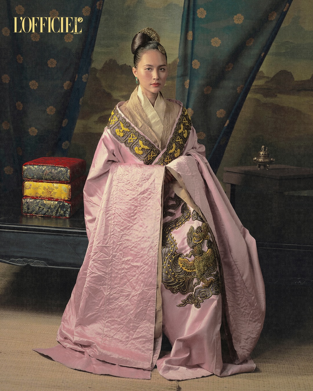 Tạo hình được lấy cảm hứng từ yến tiệc hoàng cung năm 979, có sự đầu tư nghiên cứu cổ phục theo các tài liệu lịch sử. Bộ váy khiến khán giả xuýt xoa vì màu sắc đẹp, dù là tông trầm nhưng vẫn rất sang trọng, với chất liệu dày dặn nhưng vẫn có độ rủ mềm, nhiều lớp tạo cảm giác trang trọng nhưng không nặng nề.