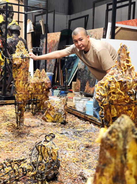 Nghệ sĩ Lê Hữu Hiếu trong quá trình thực hiện tác phẩm