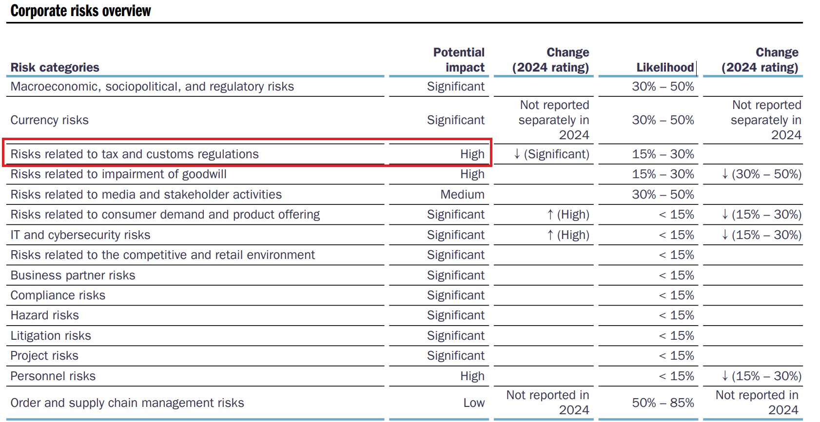 Tuy tăng trưởng mạnh, Adidas vẫn "rụt rè" khi nói về thuế quan. Adidas cho biết việc tăng thuế quan của Hoa Kỳ đối với hàng hóa từ Châu Á đã tạo ra áp lực chi phí lớn cho ngành hàng thể thao, khiến cho Adidas phải xếp hạng rủi ro về quy định thuế và hải quan ở mức cao.
