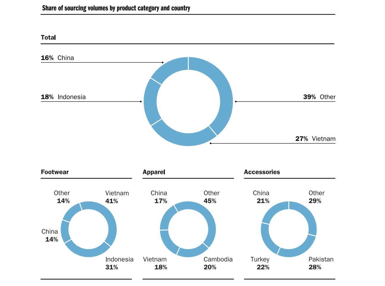 Tính riêng da giày, Việt Nam là "đại nhà máy" của Adidas, chiếm tới 41% tổng sản lượng của Adidas, là con số cao nhất. Về quần áo, sản xuất tại Việt nam chiếm tới 18%, chỉ sau Campuchia với 20%.