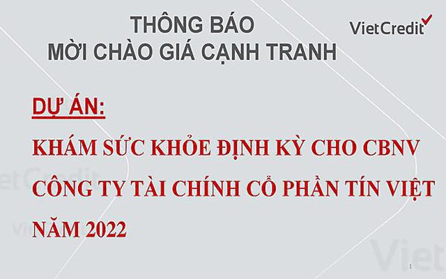 Công ty Tài chính Cổ phần Tín Việt (VietCredit) thông báo mời chào giá cạnh tranh dự án: Khám sức khỏe định kỳ cho CBNV Công ty Tài chính cổ phần Tín Việt năm 2022.