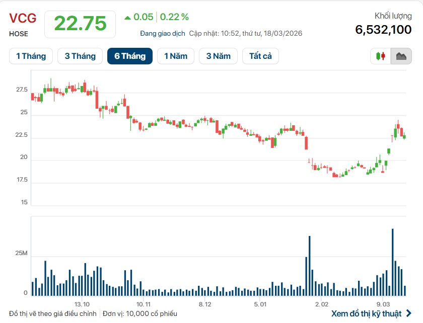 Trên thị trường chứng khoán, cổ phiếu VCG thời gian gần đây ghi nhận biến động mạnh cả về giá và thanh khoản. Trong các phiên giữa tháng 3/2026, thị giá dao động quanh vùng 22.000 – 23.600 đồng/cổ phiếu, có thời điểm tăng trần liên tiếp với khối lượng giao dịch lên tới hàng chục triệu đơn vị mỗi phiên.